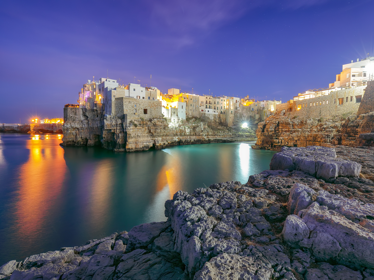 - Polignano a Mare: cidade sobre falésias, com varandas voltadas ao mar e um cenário dramático esculpido pela água.